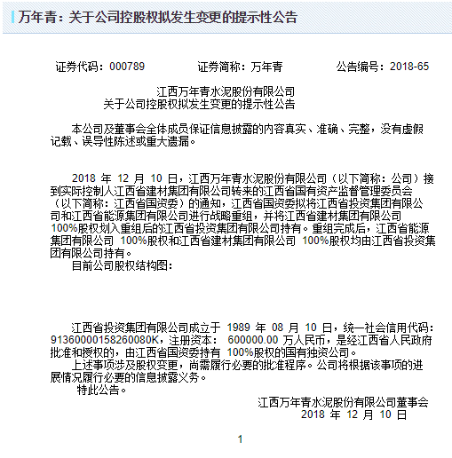 根據(jù)安源煤業(yè)集團股份有限公司關(guān)于控股股東實施戰(zhàn)略重組的提示性公告顯示,接到控股股東江西省能源集團有限公司(以下簡稱“江能集團”)通知,江能集團于2018年12月10日收到江西省國有資產(chǎn)監(jiān)督管理委員會(以下簡稱“江西省國資委”)通知,擬將江西省投資集團有限公司(以下簡稱“江西省投資集團”)和江能集團進(jìn)行戰(zhàn)略重組,重組完成后,江能集團100%股權(quán)由江西省投資集團持有。目前,相關(guān)程序正報江西省政府批準(zhǔn)。與此同時,萬年青也發(fā)布公告,江西省國資委擬將江西省投資集團和江西省能源集團進(jìn)行戰(zhàn)略重組,并將江西省建材集團100%股權(quán)劃入重組后的江西省投資集團持有。重組完成后,江西省能源集團100%股權(quán)和江西省建材集團100%股權(quán)均由江西省投資集團持有。
