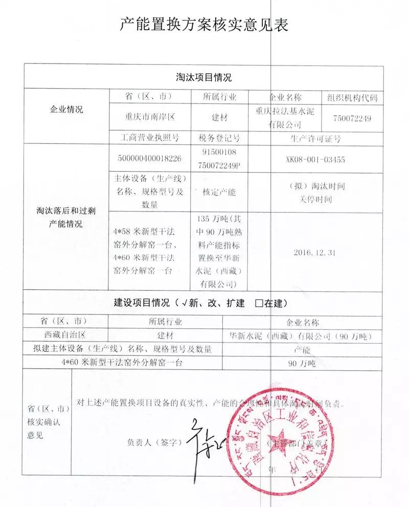 華新水泥(西藏)有限公司產(chǎn)能置換方案核實意見表
