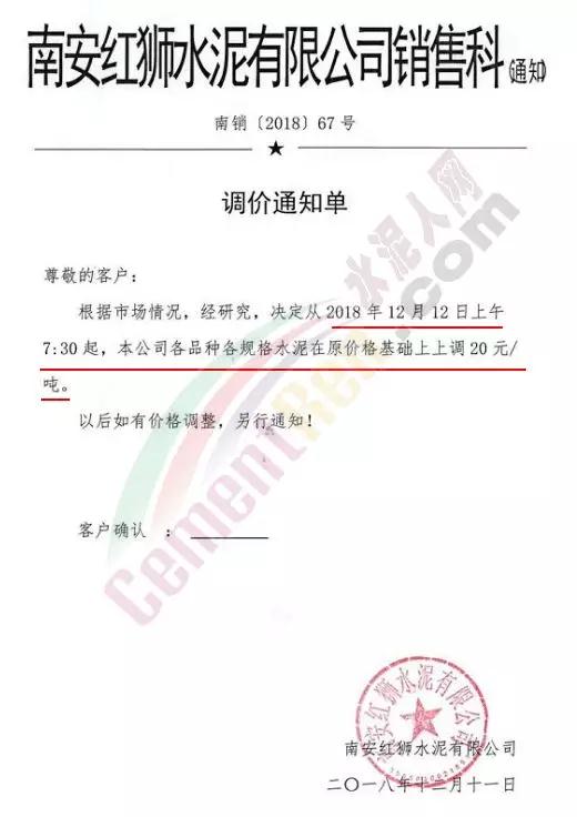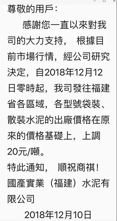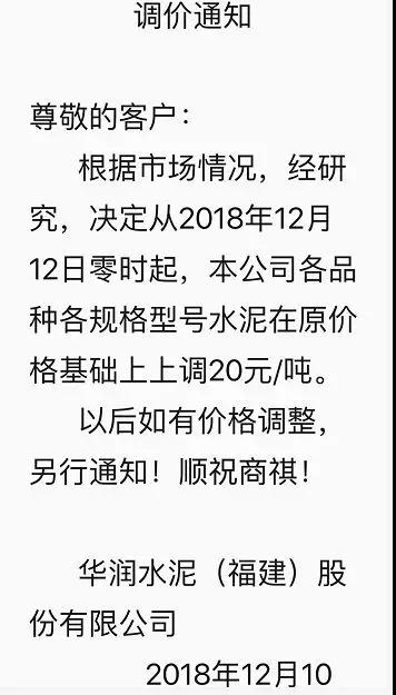 基于目前市場行情,結(jié)合我司實際情況,經(jīng)我公司研究決定,自2018年12月12日零時起,我公司發(fā)往福建省全區(qū)域的各品牌、品種袋裝、散裝水泥的出廠價格在原有基礎(chǔ)上上調(diào): 20元/噸。