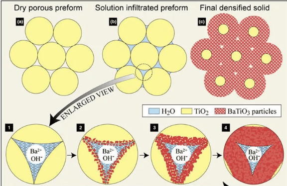 在論文中,Riman教授指出了利用reactive hydrothermal liquid-phase densification (rHLPD)工藝,通過流體,在傳統(tǒng)的水泥材料微粒上“外包”了一層BaTiO3的原理,見上圖。