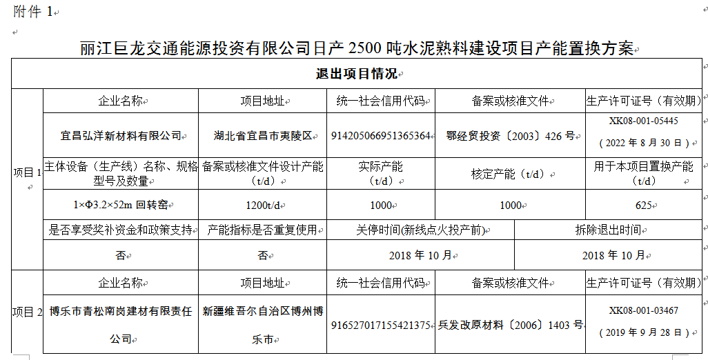 附件:1.麗江巨龍交通能源投資有限公司日產(chǎn)2500噸水泥熟料建設(shè)項目產(chǎn)能置換方案