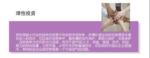其一,預(yù)拌混凝土行業(yè)的利潤仍然可觀,否則會出現(xiàn)資本的退出而非繼續(xù)進(jìn)入; 其二,預(yù)拌混凝土行業(yè)的競爭仍然是不完全的市場競爭,所謂價值洼地的投資是資本喜歡進(jìn)入的地方,在區(qū)域市場競爭中,靠所謂的地方保護(hù)、黑勢力保護(hù),關(guān)系保護(hù),這種競爭方式仍然大行其道,而并不是PK的人才、資金、管理、技術(shù)、風(fēng)控能力的綜合較量,大而不強(qiáng)、小而不死仍然普遍存在,在現(xiàn)有的中國式企業(yè)管理中,單純的談企業(yè)規(guī)范管理是一個不接地氣的話題。
