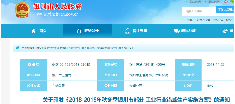 附原文:關(guān)于印發(fā)《2018-2019年秋冬季銀川市部分工業(yè)行業(yè)錯(cuò)峰生產(chǎn)實(shí)施方案》的通知