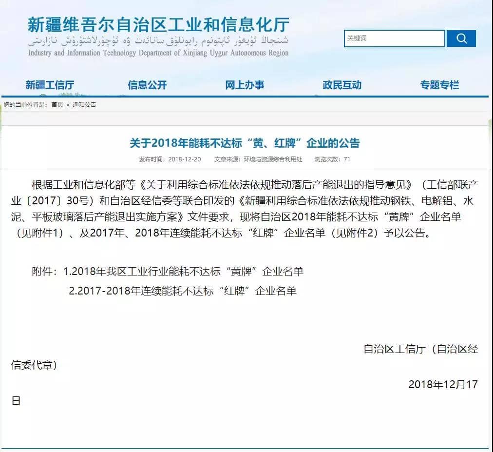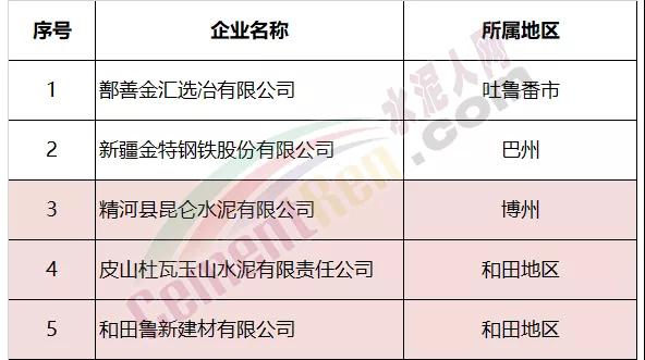 日前,新疆維吾爾自治區(qū)工信廳發(fā)布了《關(guān)于2018年能耗不達(dá)標(biāo)“黃、紅牌”企業(yè)的公告》公告文件稱,根據(jù)工信部等《關(guān)于利用綜合標(biāo)準(zhǔn)依法依規(guī)推動(dòng)落后產(chǎn)能退出的指導(dǎo)意見》(工信部聯(lián)產(chǎn)業(yè)〔2017〕30號(hào))和新疆維吾爾自治區(qū)經(jīng)信委等聯(lián)合印發(fā)的《新疆利用綜合標(biāo)準(zhǔn)依法依規(guī)推動(dòng)鋼鐵、電解鋁、水泥、平板玻璃落后產(chǎn)能退出實(shí)施方案》文件要求,將自治區(qū)2018年能耗不達(dá)標(biāo)“黃牌”企業(yè)名單及2017年、2018年連續(xù)能耗不達(dá)標(biāo)“紅牌”企業(yè)名單予以公告。名單中包括三家水泥企業(yè)分別為:2018年新疆區(qū)工業(yè)行業(yè)能耗不達(dá)標(biāo)“黃牌”水泥企業(yè)名單為新疆和靜天山水泥有限責(zé)任公司。2017-2018年新疆區(qū)工業(yè)行業(yè)能耗連續(xù)不達(dá)標(biāo)“紅牌”水泥企業(yè)3家,分別為精河縣昆侖水泥有限公司、皮山杜瓦玉山水泥有限責(zé)任公司和田魯新建材有限公司