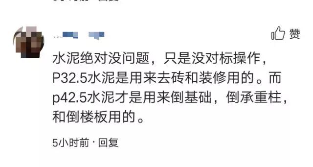 2、還有的網(wǎng)友說:水泥絕對沒問題,只是沒對標(biāo)操作,P32.5水泥是用來去磚和裝修用的。而P42.5水泥才是用來倒基礎(chǔ),倒承重柱,和倒樓板用的。