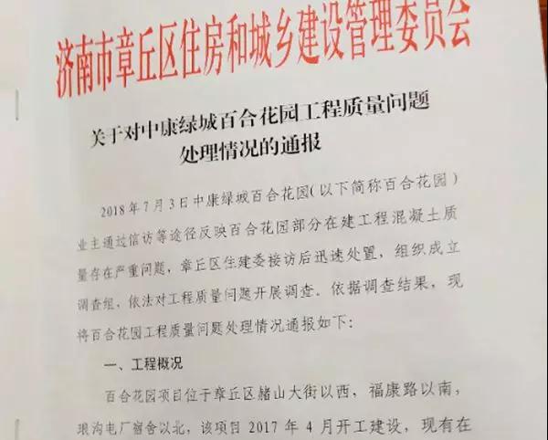 這位負(fù)責(zé)人向記者出示了濟(jì)南市章丘區(qū)住房和城鄉(xiāng)建設(shè)管理委員會(huì)《關(guān)于對(duì)中康綠城百合花園工程質(zhì)量問(wèn)題處理情況的通報(bào)》。