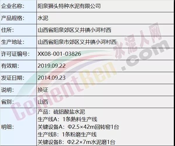 質(zhì)檢總局生產(chǎn)許可證辦公室數(shù)據(jù)顯示陽泉獅頭特種水泥有限公司主要以生產(chǎn)鋁酸鹽水泥系列為主,為窯磨一體全能企業(yè),熟料生產(chǎn)線關(guān)鍵設(shè)備為Φ2.5×42m回轉(zhuǎn)窯1臺;水泥粉磨生產(chǎn)線關(guān)鍵設(shè)備為Φ2.2×7m水泥磨1臺。