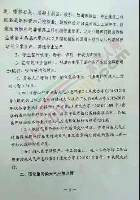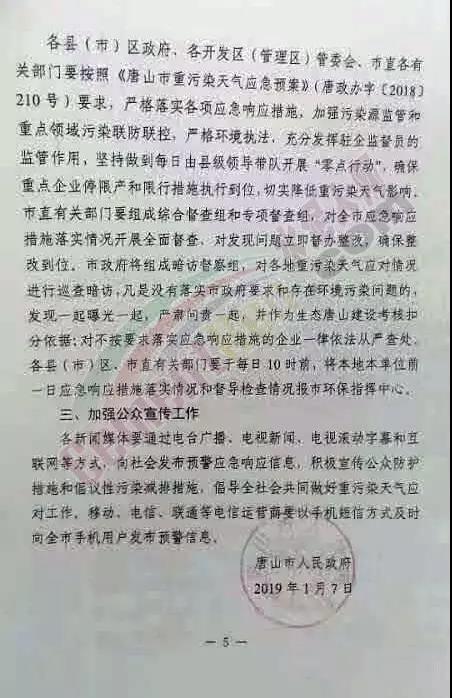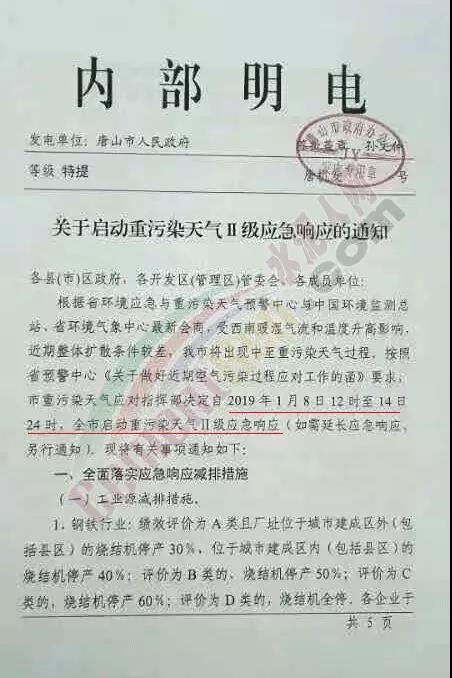 水泥人網(wǎng)最新消息,唐山市人民政府發(fā)布內(nèi)部明電《關(guān)于啟動(dòng)重污染天氣II級(jí)應(yīng)急響應(yīng)的通知》,通知稱因唐山市未來(lái)幾天將出現(xiàn)中至重污染天氣,按照相關(guān)要求,唐山市重污染天氣應(yīng)對(duì)指揮部決定自今日(1月8日12時(shí)至14日24時(shí),全市啟動(dòng)重污染天氣II級(jí)應(yīng)急響應(yīng)。