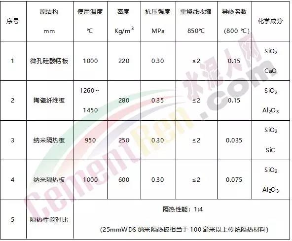 納米隔熱材料是采用納米技術,添加了獨特的反紅外輻射材料,采取特殊的工藝生產出來的納米級微孔隔熱材料,相比較于傳統(tǒng)陶瓷纖維和微孔硅酸鈣板這類微米級氣孔隔熱材料,納米隔熱材料的氣孔在20納米左右,這是導致其導熱系數(shù)成為迄今為止最低的隔熱材料,同樣溫度下的隔熱性能比傳統(tǒng)要好4倍,詳細的性能對比見表—1。