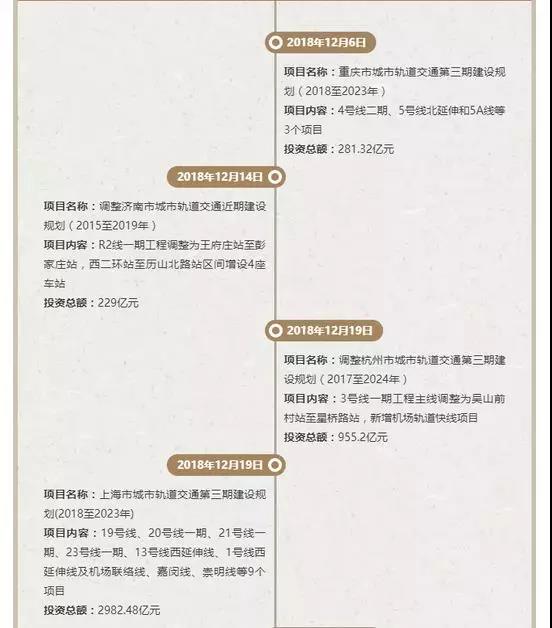 2019年開工第一周,國(guó)家發(fā)改委先后批復(fù)了《江蘇省沿江城市群城際鐵路建設(shè)規(guī)劃(2019-2025年)》和《武漢市城市軌道交通第四期建設(shè)規(guī)劃(2019—2024年)》,兩個(gè)規(guī)劃涉及投資3786億元。而在此之前,已有廣西北部灣經(jīng)濟(jì)區(qū)、上海、重慶、杭州、濟(jì)南等多個(gè)軌道交通規(guī)劃獲批復(fù)。