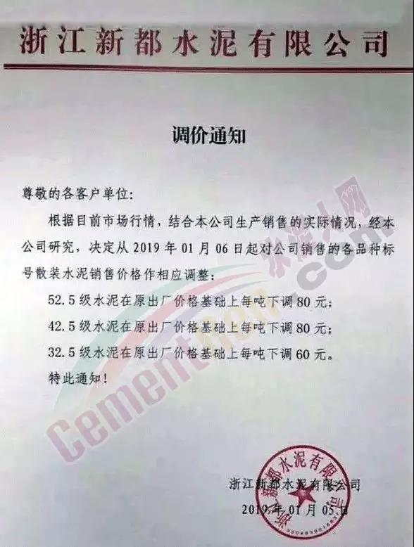 根據(jù)海螺調(diào)價(jià)涵及本地行情,我公司從2019年1月06日08:00起,32.5各品種水泥下調(diào)60元/噸,42.5各品種水泥下調(diào)80元/噸,對于本次價(jià)格調(diào)整對貴單位造成的不便,請給予理解和支持。