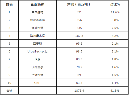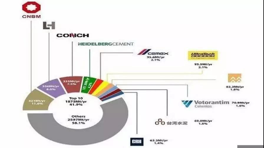 2018年《環(huán)球水泥網(wǎng)》公布的全球前十大水泥生產(chǎn)商中前10大企業(yè)占據(jù)了全球41.8%的產(chǎn)能,其中四家中國水泥企業(yè)(包含臺灣)合計產(chǎn)能10億噸,占據(jù)了前十大合計產(chǎn)能的54%。