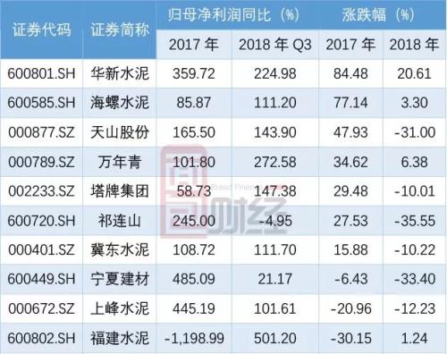 這其中,華新水泥(17.37 +0.99%,診股)(600801.SH)表現(xiàn)尤為亮眼,2017年及2018年前三季度歸母凈利潤同比增幅均超過2倍,2017年及2018年股價年度漲幅分別為84.48%及20.61%,均位于行業(yè)首位。