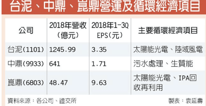 循環(huán)經(jīng)濟(jì)正夯,也是市場趨勢,臺泥(1101)、中鼎(9933)、崑鼎(6803)近2年投資的環(huán)保、綠能產(chǎn)業(yè)場域,2019年將可陸續(xù)收成;市場預(yù)估,今年這些企業(yè)在循環(huán)經(jīng)濟(jì)的產(chǎn)值會比去年翻倍。