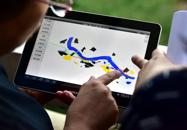 2017年9月7日,原環(huán)境保護部組織的長江經(jīng)濟帶飲用水水源地環(huán)境保護執(zhí)法專項行動第一督查組在湖北武漢督查。圖為督查人員通過飲用水水源保護區(qū)現(xiàn)場巡查衛(wèi)星遙感支持系統(tǒng)在現(xiàn)場檢查。攝影/章軻