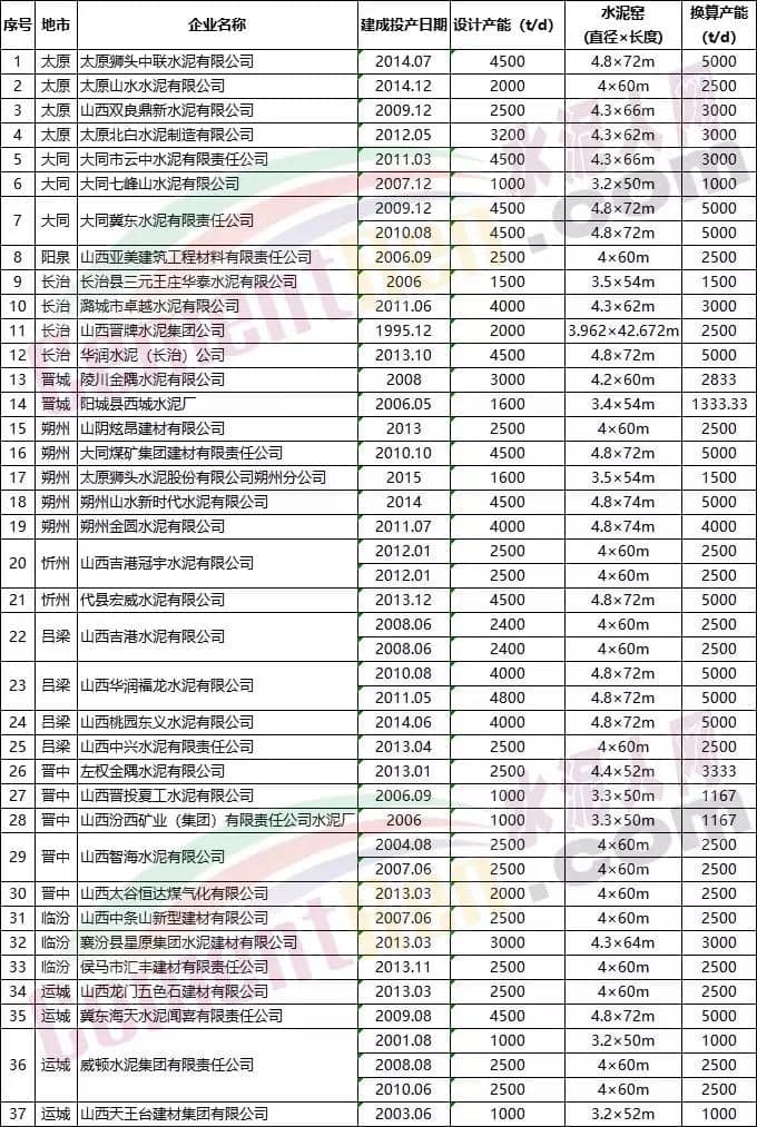 山西省部分水泥熟料企業(yè)名單