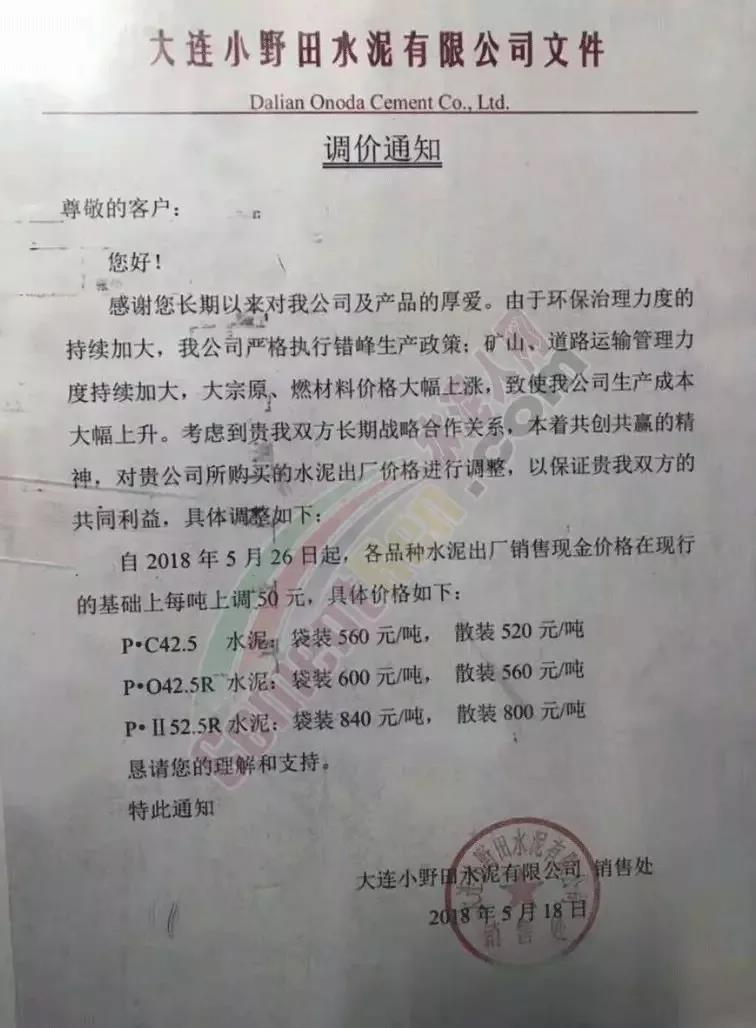2018年5月18日大連小野田水泥有限公司銷售處發(fā)布調(diào)價通知稱,由于環(huán)保治理力度的持續(xù)大加,公司嚴(yán)格執(zhí)行錯峰生產(chǎn)政策;礦山、道路運輸管理力度加大,大宗原、燃材料價格大幅上漲,致使公司生產(chǎn)成本大幅上升。為保證企業(yè)與用戶的共同利益,將水泥價格上調(diào)。其中P.II52.5R袋裝水泥市場零售到位價在860-870元/噸。