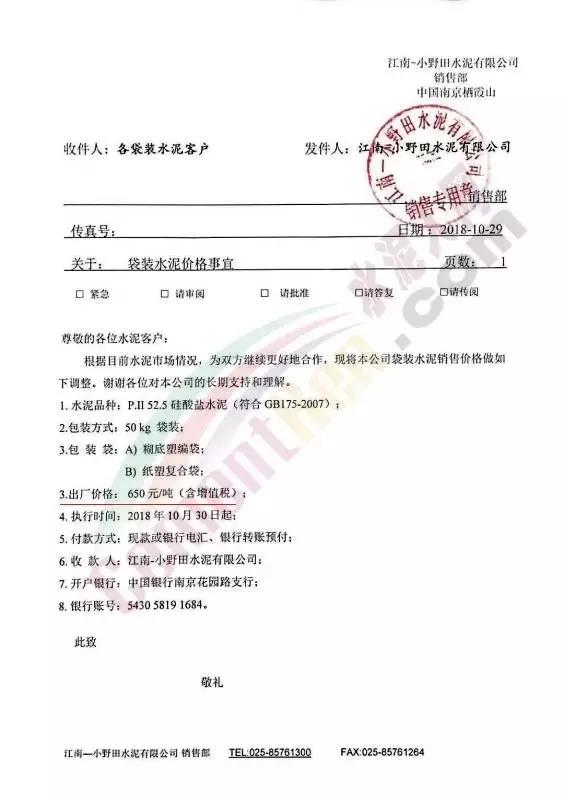 2018年10月30日江南-小野田水泥有限公司銷售部中國南京棲霞山廠發(fā)出水泥調(diào)價通知稱:根據(jù)目前水泥市場情況,為雙方繼續(xù)更好的合作,將公司袋裝水泥銷售價格上調(diào)。上調(diào)之后執(zhí)行價高達650元/噸。時隔月余這家企業(yè)再發(fā)通知上調(diào)P.II52.5硅酸鹽水泥價格,上調(diào)后出廠價格執(zhí)行700元/噸,市場到位達接近800元/噸。