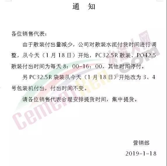 昨日(1月18日)黑龍江哈爾濱某水泥企業(yè)營銷部發(fā)布通知稱:由于散裝水泥付出量減少公司對散裝水泥付貨時(shí)間進(jìn)行調(diào)整,每天8點(diǎn)到下午4點(diǎn)發(fā)貨,其他時(shí)間停付。袋裝水泥發(fā)貨時(shí)間不變。