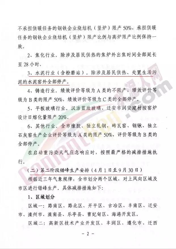 水泥行業(yè)(含粉磨站)。4、8、9月份,區(qū)域二內(nèi)所有水泥企業(yè)輪流停產(chǎn),每家企業(yè)停產(chǎn)時(shí)間不少于45天。5、6、7月份區(qū)域一內(nèi)所有水泥企業(yè)輪流停產(chǎn),每家企業(yè)停產(chǎn)時(shí)間不少于46天。