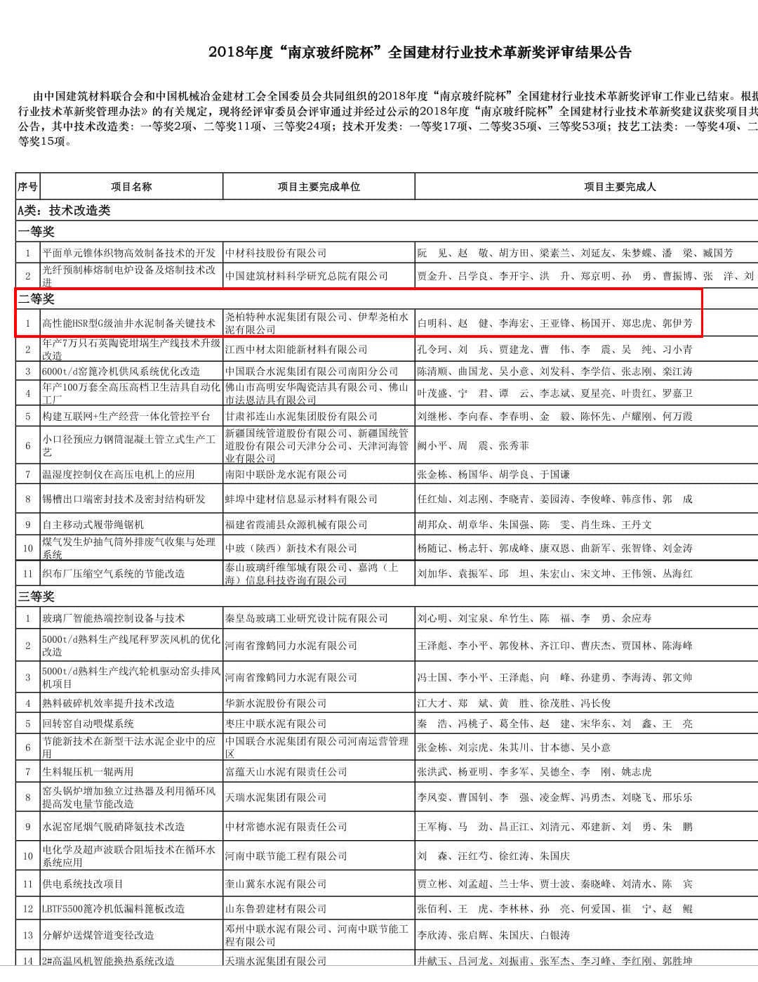 由中國建筑材料聯(lián)合會和中國機械冶金建材工會全國委員會共同組織的2018年度“南京玻纖院杯”全國建材行業(yè)技術(shù)革新獎評審工作業(yè)已結(jié)束, 堯柏集團《高性能HSR型G級油井水泥制備關(guān)鍵技術(shù)》項目榮獲2018年度全國建材行業(yè)技術(shù)革新獎技術(shù)改造類二等獎。