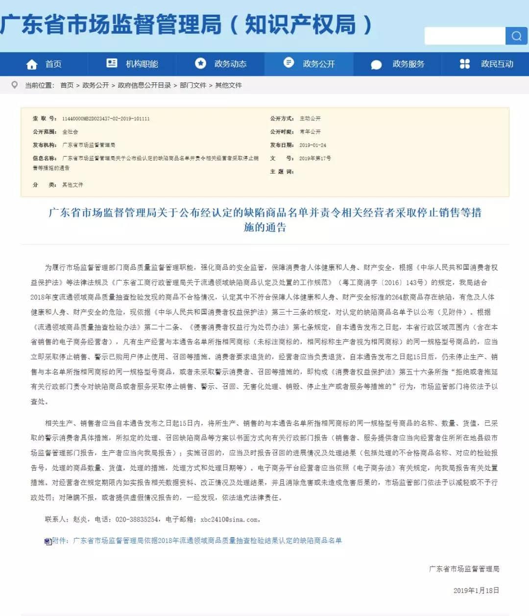 近日,廣東省市場監(jiān)督管理局官網(wǎng)發(fā)布《廣東省市場監(jiān)督管理局關于公布經(jīng)認定的缺陷商品名單并責令相關經(jīng)營者采取停止銷售等措施的通告》稱:為履行市場監(jiān)督管理部門商品質(zhì)量監(jiān)督管理職能,強化商品的安全監(jiān)管,保障消費者人體健康和人身、財產(chǎn)安全,根據(jù)《中華人民共和國消費者權(quán)益保護法》等法律法規(guī)及《廣東省工商行政管理局關于流通領域缺陷商品認定及處置的工作規(guī)范》(粵工商消字〔2016〕143號)的規(guī)定,廣東省市場監(jiān)督管理局結(jié)合2018年度流通領域商品質(zhì)量抽查檢驗發(fā)現(xiàn)的商品不合格情況,認定其中不符合保障人體健康和人身、財產(chǎn)安全標準的264款商品存在缺陷,有危及人體健康和人身、財產(chǎn)安全的危險,并依據(jù)《中華人民共和國消費者權(quán)益保護法》第三十三條的規(guī)定,對認定的缺陷商品名單予以公布。通告全文如下: