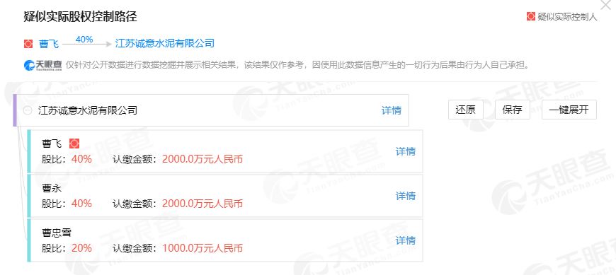 天眼查數(shù)據(jù)顯示,江蘇誠意水泥有限公司法定代表人曹忠雪,其擁有公司20%的股份?! ?/p>