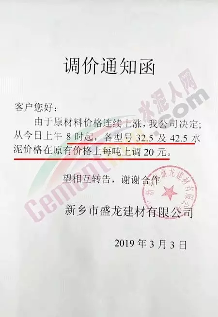 3月3日,新鄉(xiāng)市盛龍建材有限公司發(fā)布調(diào)價通知函,稱由于原材料價格連續(xù)上漲,公司決定自3月3日上午8時起,各型號32.5及42.5水泥價格在原有價格上每噸上調(diào)20元。
