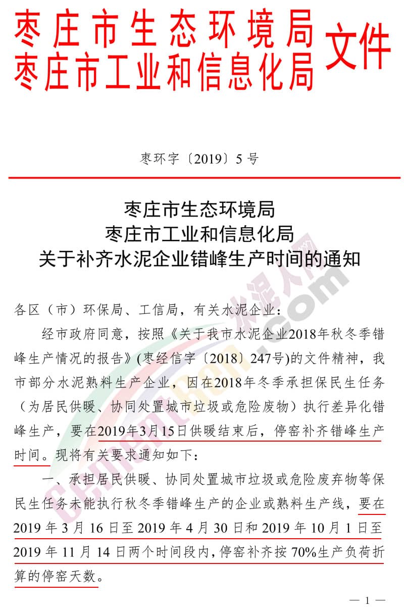 日前,棗莊市生態(tài)環(huán)境局及棗莊市工業(yè)和信息化局聯(lián)合發(fā)布《關(guān)于補齊水泥企業(yè)錯峰生產(chǎn)時間的通知》,要求在2018年冬季承擔(dān)居民供暖、協(xié)同處置城市垃圾或危險廢棄物等保民生任務(wù)未能執(zhí)行秋冬季錯峰生產(chǎn)的企業(yè)或熟料生產(chǎn)線,要在2019年3月16日至2019年4月30日和2019年10月1日至2019年11月14日兩個時間段內(nèi),停窯補齊按70%生產(chǎn)負荷折算的停窯天數(shù)。