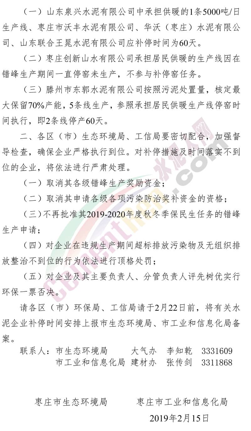 (一)山東泉興水泥有限公司中承擔(dān)供暖的1條5000噸/日生產(chǎn)線、棗莊市沃豐水泥有限公司、華沃(棗莊)水泥有限公司、山東聯(lián)合王晁水泥有限公司應(yīng)補停時間為60天。