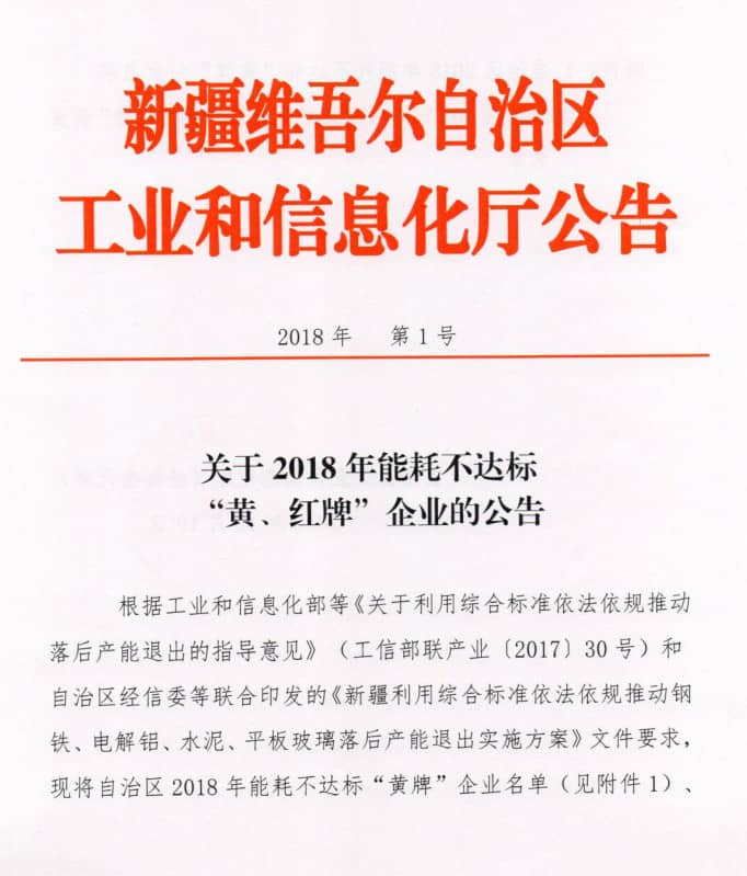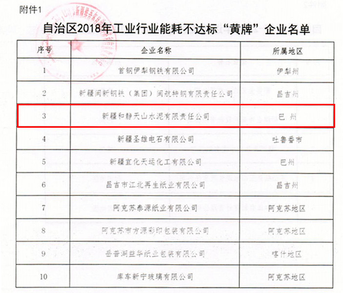 據(jù)水泥人網(wǎng)了解,在2018年12月,新疆維吾爾自治區(qū)工信廳發(fā)布了《關(guān)于2018年能耗不達標(biāo)“黃、紅牌”企業(yè)的公告》,公告中提到新疆和靜天山水泥有限責(zé)任公司被列為新疆2018年工業(yè)行業(yè)能耗不達標(biāo)“黃牌”企業(yè)。