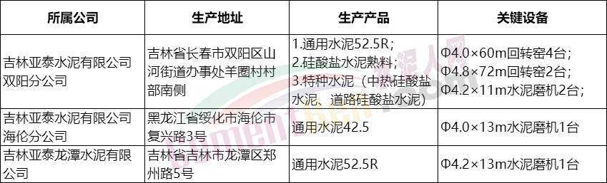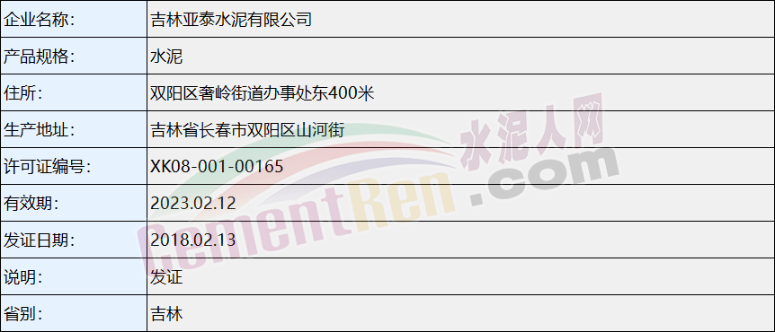 吉林亞泰水泥有限公司生產許可證信息