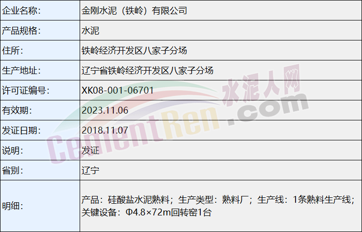 金剛水泥(鐵嶺)有限公司 生產許可證信息