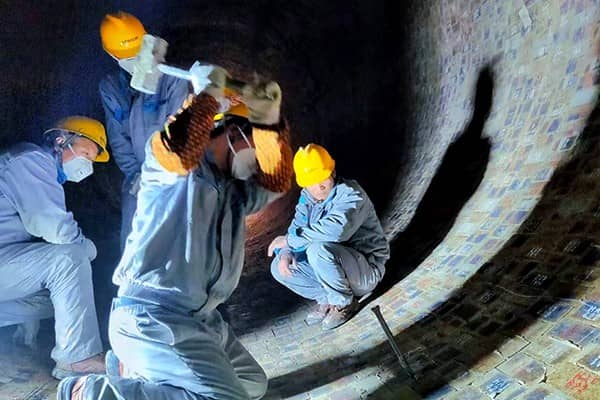 負(fù)責(zé)窯檢修的工人分批進(jìn)入窯內(nèi)砌磚。每塊磚的疊放,工人師傅都會(huì)用橡皮錘狠狠地敲擊,確保嚴(yán)絲合縫。“磚與磚之間不能有縫,否則在窯運(yùn)轉(zhuǎn)的過(guò)程中很有可能發(fā)生掉磚事故”,班長(zhǎng)彭高彪說(shuō):“在砌完之后,我們會(huì)對(duì)241環(huán)磚逐個(gè)敲擊,遇見(jiàn)松動(dòng)的地方,會(huì)砸進(jìn)鋼板進(jìn)行加固。”