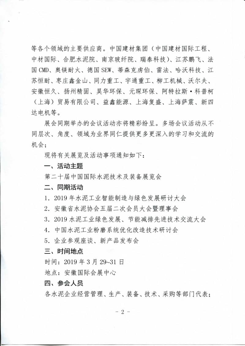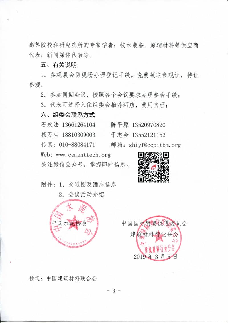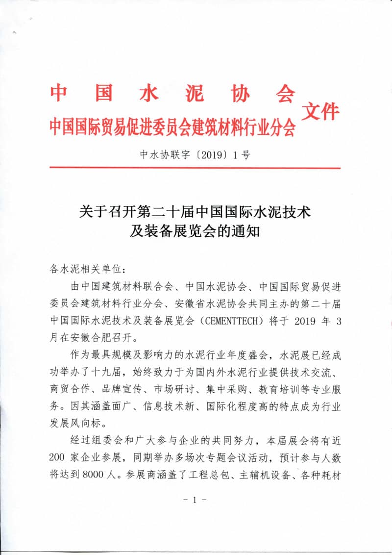 水泥人網(wǎng)消息:日前,中國水泥協(xié)會(huì),中國國際貿(mào)易促進(jìn)委員會(huì)建筑材料行業(yè)分會(huì)聯(lián)合發(fā)布了《關(guān)于召開第二十屆中國國際水泥技術(shù)及裝備展覽會(huì)的通知》(中水協(xié)聯(lián)字【2019】1號(hào))。