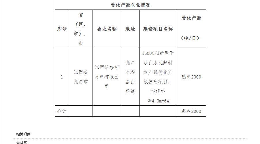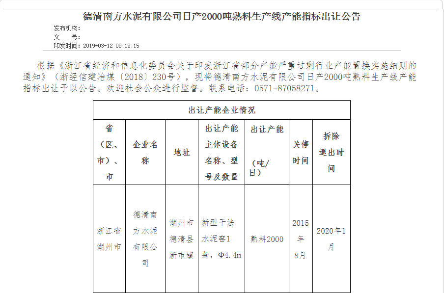 根據(jù)《浙江省經(jīng)濟和信息化委員會關(guān)于印發(fā)浙江省部分產(chǎn)能嚴重過剩行業(yè)產(chǎn)能置換實施細則的通知》現(xiàn)將德清南方水泥有限公司日產(chǎn)2000噸熟料生產(chǎn)線產(chǎn)能指標出讓予以公告。