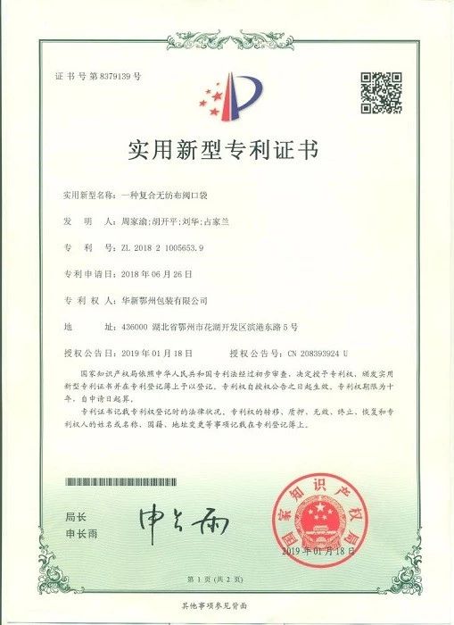 近日,華新包裝公司研制的“一種復(fù)合無紡布閥口袋”獲得了國家知識產(chǎn)權(quán)局頒發(fā)的實(shí)用新型專利證書,專利期限為10年,這是該公司獲得的第十項專利。