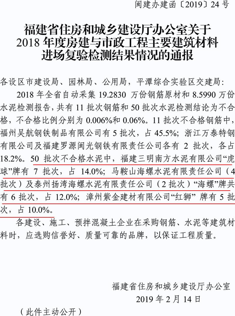 水泥人網(wǎng)消息近日,福建省住房和城鄉(xiāng)建設(shè)廳網(wǎng)站發(fā)布通報(bào)顯示,檢測(cè)發(fā)現(xiàn)50批次不合格水泥中,福建三明南方水泥有限公司“虎球”牌有7批次,占14.0%;馬鞍山海螺水泥有限責(zé)任公司(4批次)及泰州揚(yáng)灣海螺水泥有限責(zé)任公司(2批次)“海螺”牌共有6批次,占12.0%;漳州紫金建材有限公司“紅獅” 牌有5批次,占10.0%。