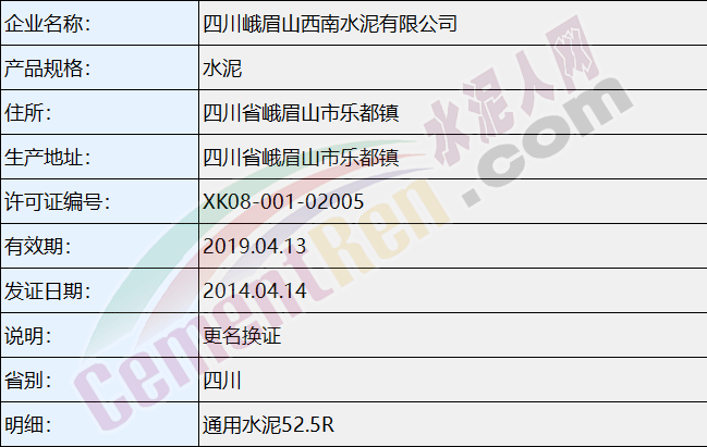 四川峨眉山西南水泥有限公司生產(chǎn)許可證信息