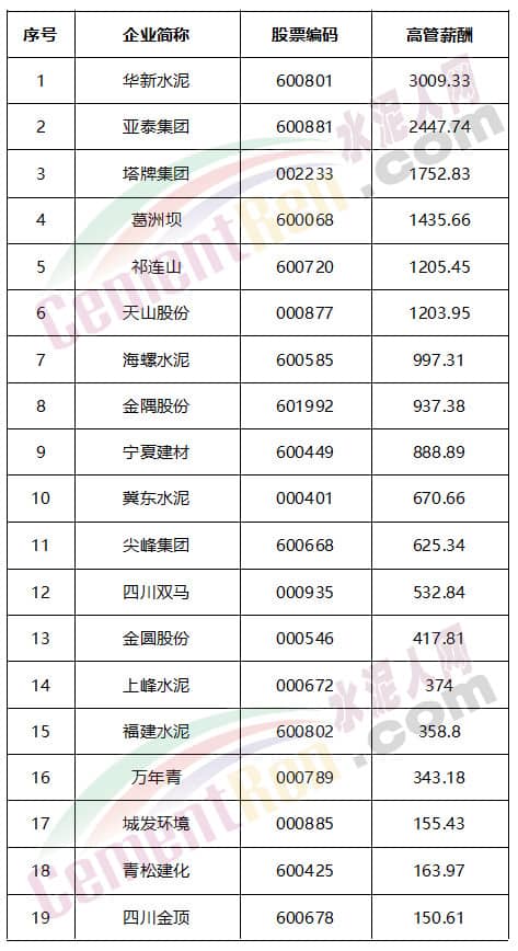 在水泥行業(yè)利潤大漲的同時,各上市公司高管薪資也有所提升。據(jù)不完全統(tǒng)計,上市企業(yè)百萬薪酬高管共七十二位。其中華新水泥李葉青以薪酬411.14萬元排名年薪過百萬上市公司高管第一名。塔牌集團(tuán)董事長鐘朝暉以薪酬273萬元排名第二位,塔牌總經(jīng)理何坤皇以254.63排名第三位。