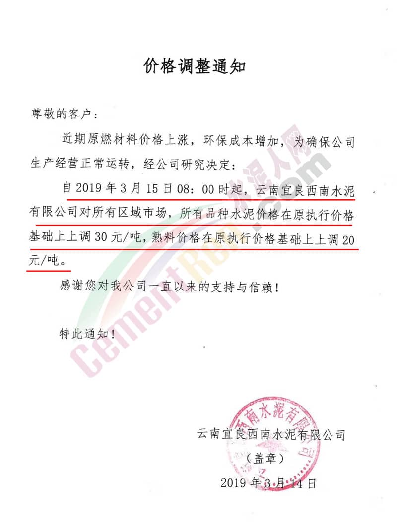 華新水泥(富民)有限公司調(diào)價(jià)通知稱(chēng),因近期水泥生產(chǎn)成本大幅度上升,為保障水泥產(chǎn)品的正常供應(yīng),自2019年3月15日8時(shí)起,所有品種水泥出廠價(jià)在原執(zhí)行價(jià)格基礎(chǔ)上上調(diào)30元/噸。