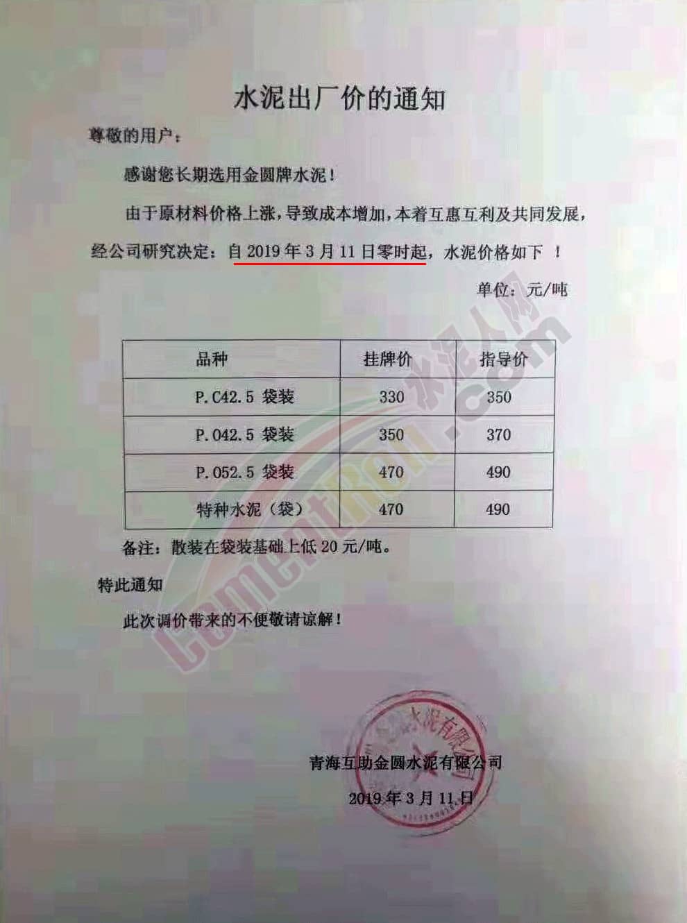 青海互助金圓水泥有限公司水泥出廠價(jià)通知稱(chēng),由于原材料價(jià)格上漲,導(dǎo)致成本增加,經(jīng)公司研究決定 自3月11日零時(shí)起調(diào)整水泥價(jià)格,其中P.O52.5袋裝水泥掛牌價(jià)470元/噸,指導(dǎo)價(jià)490元/噸。P.O42.5散裝水泥掛牌價(jià)330元/噸,指導(dǎo)價(jià)350元/噸。