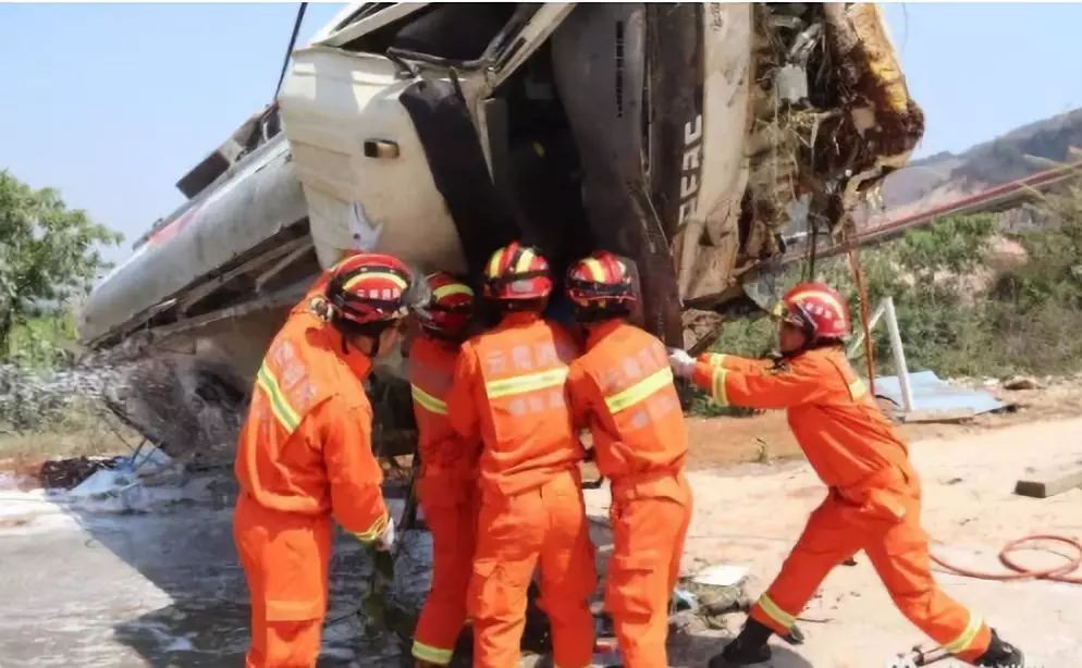 13時(shí)07分,救援人員到達(dá)現(xiàn)場后,見一輛油罐車四腳朝天、油還不停的一直在漏,經(jīng)詢問現(xiàn)場得知:1輛滿載汽油的油罐車因剎車失靈撞至路邊,駕駛室嚴(yán)重變形,導(dǎo)致油罐車內(nèi)一名人員被困,了解情況后,中隊(duì)指揮員迅速下達(dá)戰(zhàn)斗命令:滅火組利用泡沫液對罐體進(jìn)行冷卻,攻堅(jiān)組立即使用破拆工具組對車體進(jìn)行破拆;警戒組負(fù)責(zé)現(xiàn)場做好警戒,防止發(fā)生二次事故。
