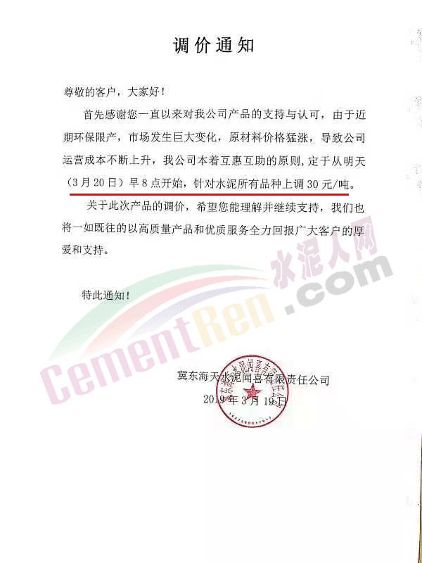 冀東海天水泥聞喜有限責(zé)任公司調(diào)價(jià)通知稱由于近期環(huán)保限產(chǎn),市場(chǎng)發(fā)生巨大變化,原材料價(jià)格猛漲,導(dǎo)致公司運(yùn)營(yíng)成本不斷上升。定于3月20日早8點(diǎn)開(kāi)始針對(duì)水泥所有品種上調(diào)30元/噸。