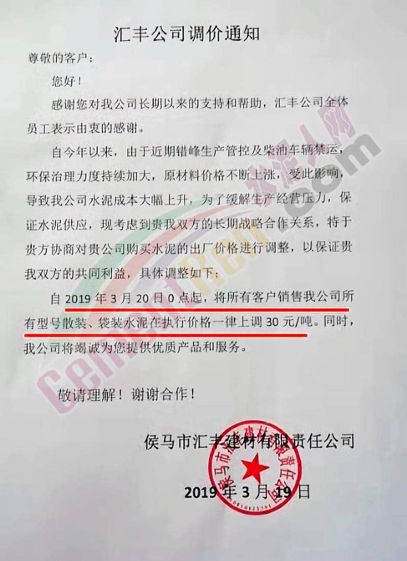 侯馬市匯豐建材有限責(zé)任公司調(diào)價(jià)通知稱自今年以來(lái),由于近期錯(cuò)峰生產(chǎn)管控及柴油車(chē)輛禁運(yùn),環(huán)保治理力度持續(xù)加大,原材料價(jià)格不斷上漲,受此影響導(dǎo)致公司水泥成本上升,為了緩解生產(chǎn)經(jīng)營(yíng)壓力,保證水泥供應(yīng)。定于3月20日零點(diǎn)起上調(diào)所有型號(hào)散裝、袋裝水泥價(jià)格,上幅幅度為30元/噸。
