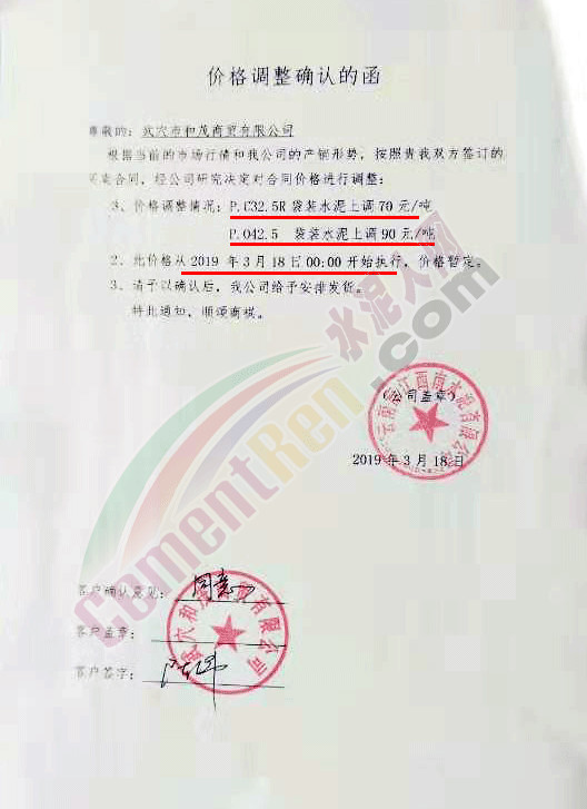 云南麗江西南水泥同期發(fā)給外圍經(jīng)銷(xiāo)商的價(jià)格調(diào)整確認(rèn)函稱,根據(jù)當(dāng)前的市場(chǎng)行情和公司的產(chǎn)銷(xiāo)形勢(shì)。經(jīng)公司研究決定從2019年3月18日00.00開(kāi)始對(duì)合同價(jià)格進(jìn)行調(diào)整:其中P.C32.5R 袋裝水泥上調(diào)70元/噸。P.042.5 袋裝水泥上調(diào)90元/噸。