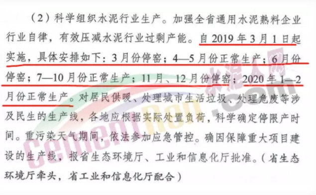 文件要求水泥行業(yè)科學(xué)組織生產(chǎn),加強(qiáng)水泥熟料企業(yè)自律,有效壓減水泥行業(yè)過(guò)剩產(chǎn)能。自3月1日起停窯限產(chǎn),4、5月正常生產(chǎn),6月停限,7-10月正常生產(chǎn),11、12月停窯。共計(jì)停限4個(gè)月,加上2019年1、2月份的停窯限產(chǎn),河南省2019年也要停限產(chǎn)6個(gè)月(180天)以上。