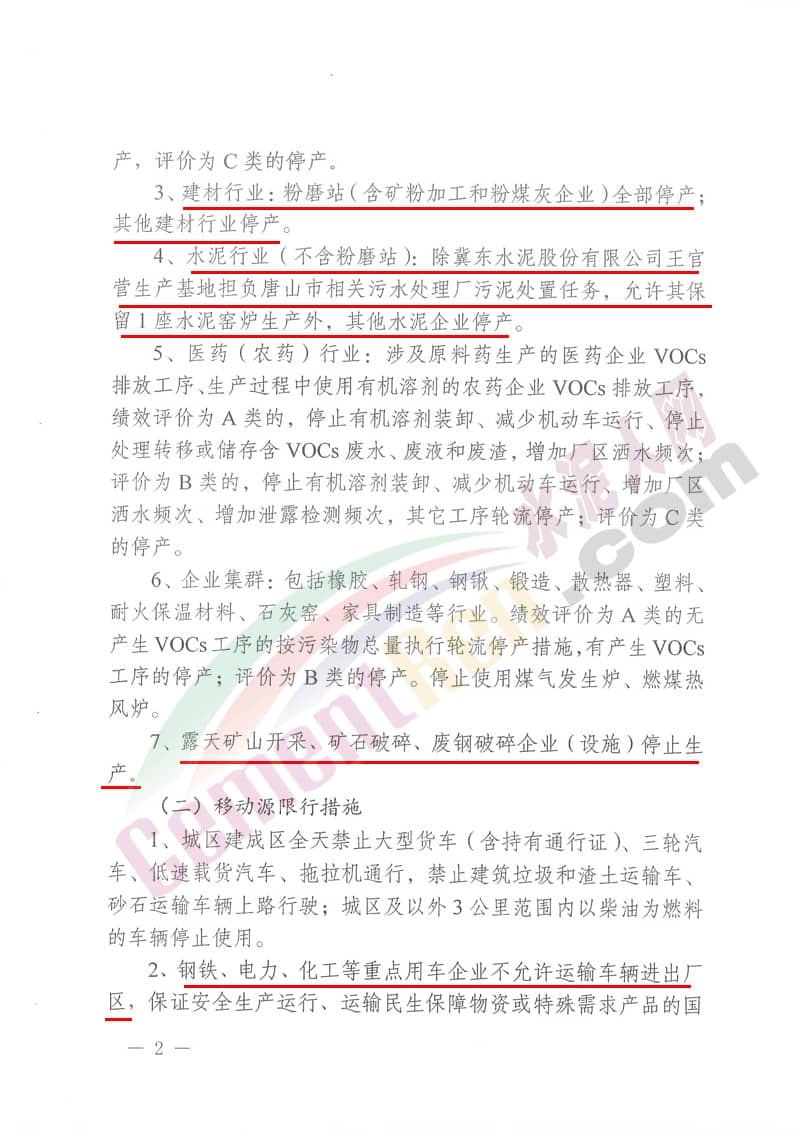 上個(gè)月底,2月28日唐山市人民政府曾發(fā)布《關(guān)于啟動(dòng)重污染天氣Ⅰ級(jí)應(yīng)急響應(yīng)的通知》要求建材行業(yè)。粉磨站停產(chǎn);水泥行業(yè)(不含粉磨站)。符合《關(guān)于建立重點(diǎn)行業(yè)超低排放(深度治理)示范引領(lǐng)制度的通知》(冀氣領(lǐng)辦〔2018〕128號(hào))要求的,不予管控;協(xié)同處置城市垃圾(含污泥)或危險(xiǎn)廢物等保民生任務(wù)的,可根據(jù)承擔(dān)任務(wù)量核定最大允許生產(chǎn)負(fù)荷生產(chǎn);承擔(dān)居民供暖的,根據(jù)承擔(dān)任務(wù)量核定最大允許生產(chǎn)負(fù)荷生產(chǎn)。其他企業(yè)停產(chǎn)。