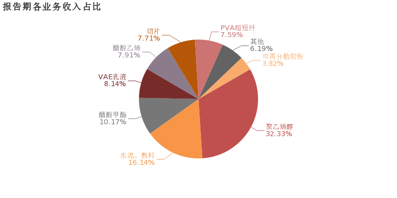 從業(yè)務結(jié)構(gòu)來看,“聚乙烯醇”是企業(yè)營業(yè)收入的主要來源。具體而言, “聚乙烯醇”營業(yè)收入為18.6億,營收占比為32.3%。“水泥、熟料”營業(yè)收入為9.3億,營收占比為16.1%。“醋酸甲酯”營業(yè)收入為5.8億,營收占比為10.2%。