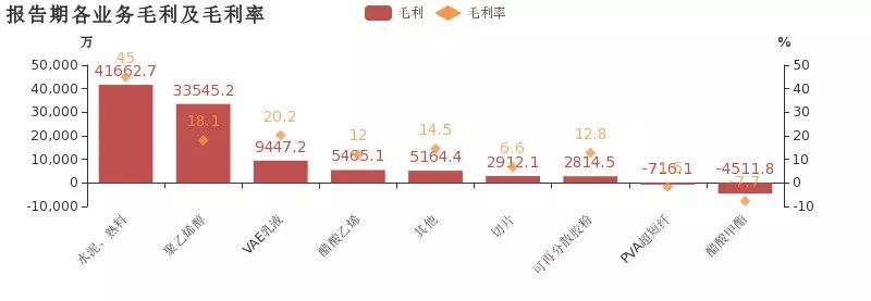 利潤貢獻角度,“水泥、熟料”毛利貢獻最大。報告期內(nèi),企業(yè)綜合毛利率為16.5%。其中,“水泥、熟料”、“聚乙烯醇”、“VAE乳液”毛利貢獻占比分別為43.5%、35%、9.9%,“水泥、熟料”貢獻較大毛利。“水泥、熟料”、“聚乙烯醇”、“VAE乳液”毛利率分別為45%、18.1%、20.2%。